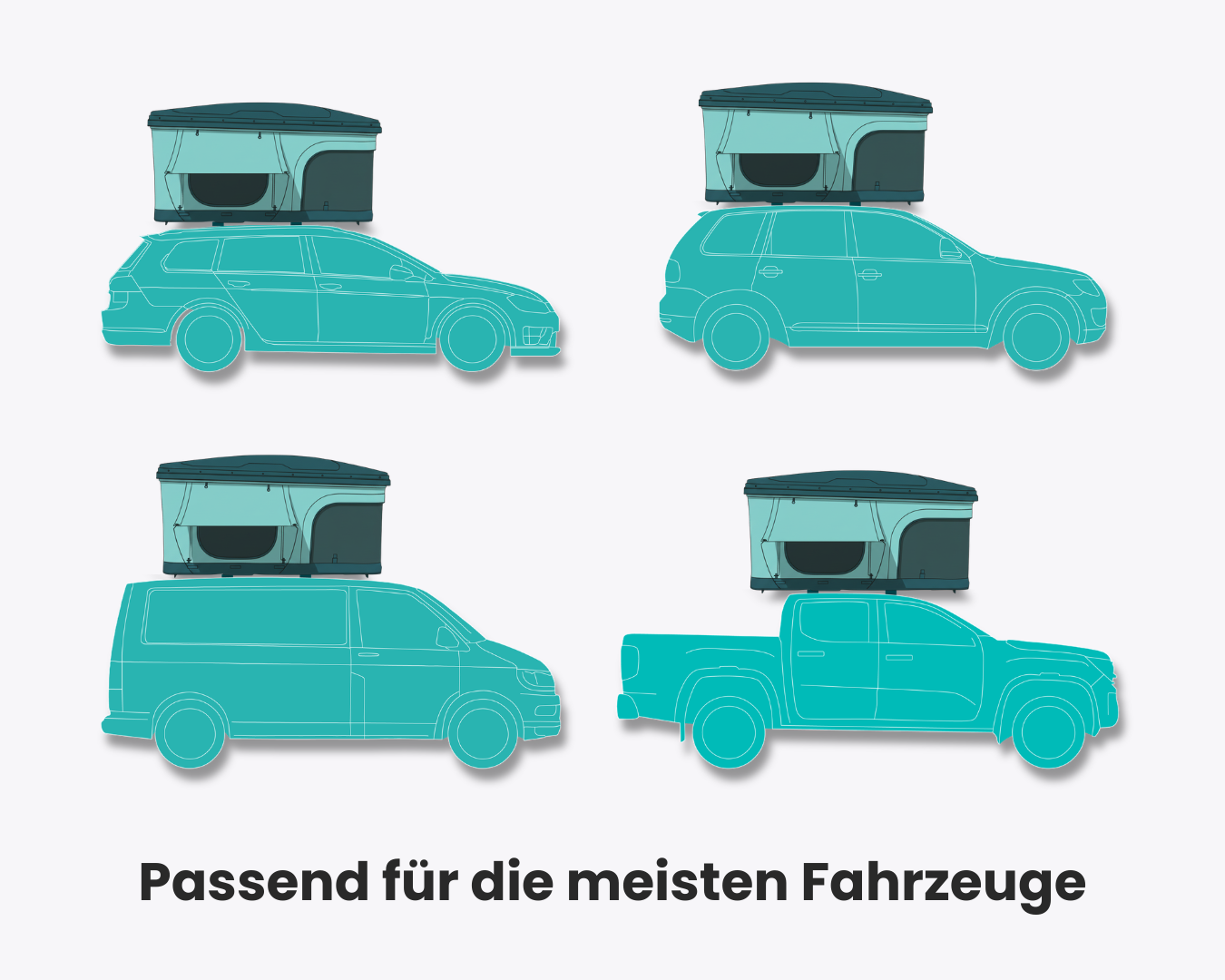 - Die Dachlänge: Das Zelt sollte nicht wesentlich länger als dein Fahrzeugdach sein. Das sorgt für eine bessere Aerodynamik und stellt sicher, dass der Abstand deiner Querträger für die Montageschienen des Zeltes ausreicht.
