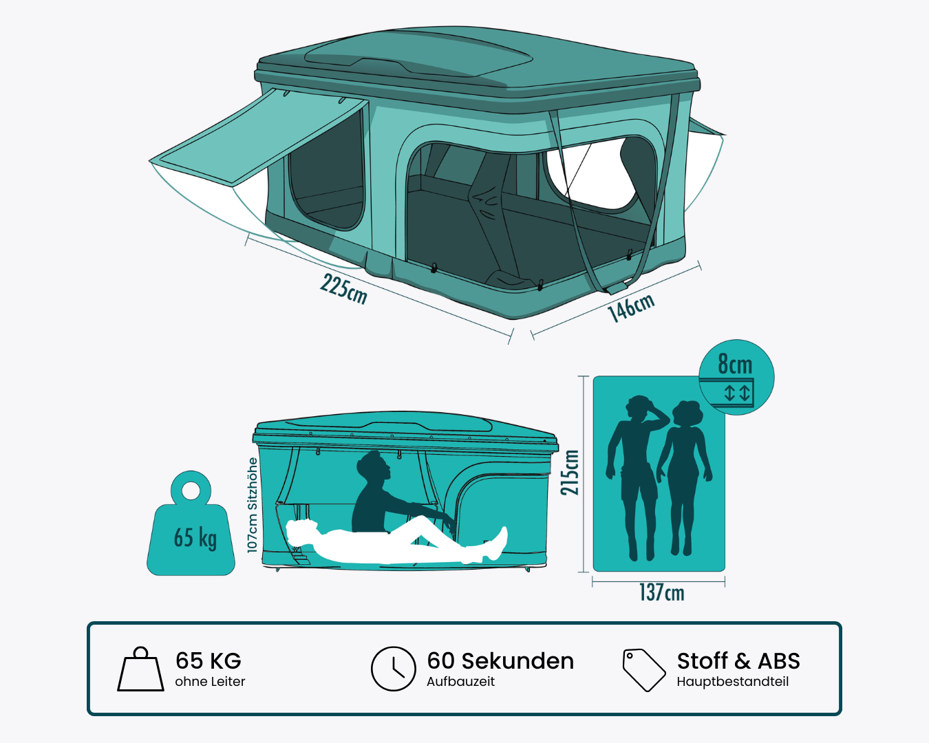 Damit das Zelt perfekt zu deinem Auto passt, sind vor allem zwei technische Werte entscheidend: